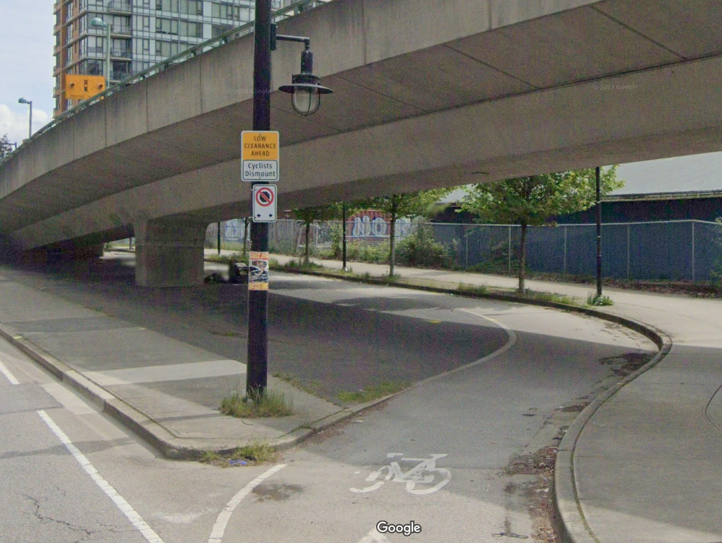 Facing eastbound on Pacific Blvd below the Cambie Street Bridge on the Seaside Bypass bike route (via Google Street View)