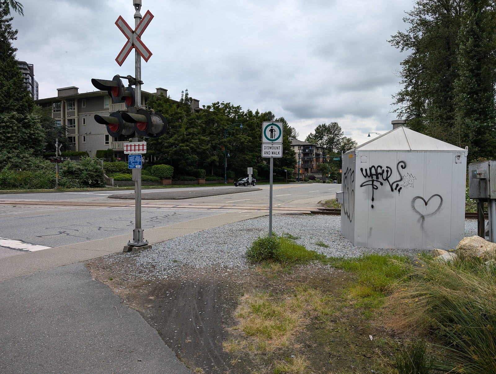 Facing westbound on Murray St at the Capilano Rd level crossing on the Guildford Way bike route
