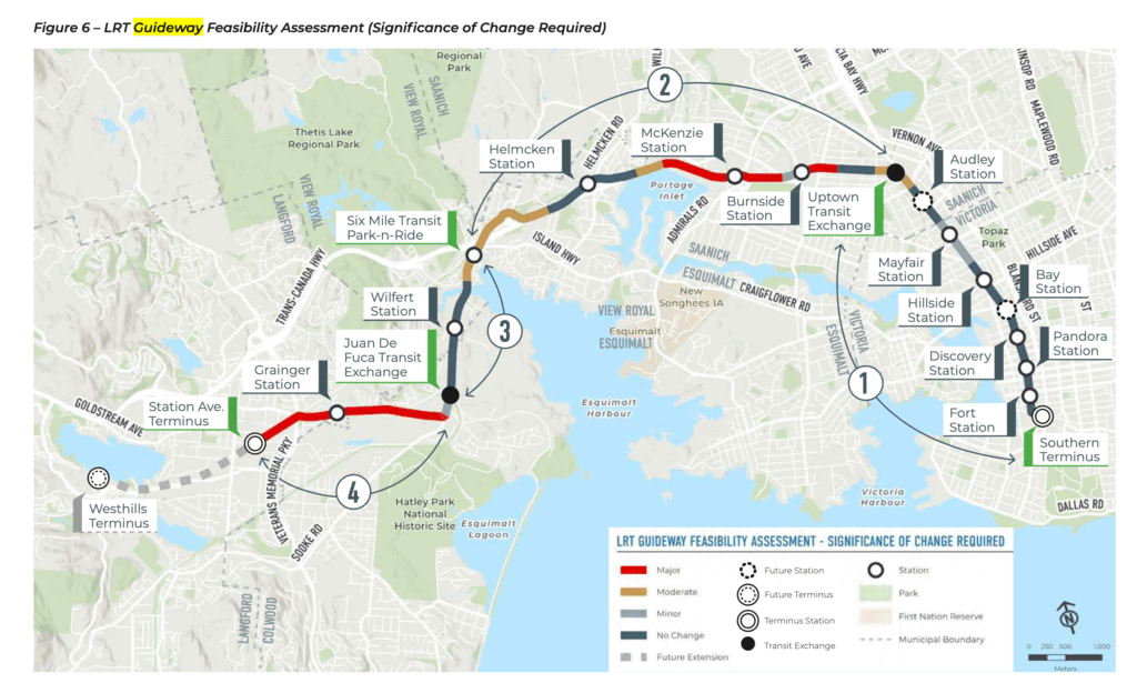 The 2011 rapid transit report assessed three scenarios: Bus Rapid Transit, Light Rail Transit, and business-as-usual. All scenarios considered the same alignment, following Douglas St to Uptown, and Highway 1 and Goldstream Avenue to Colwood Corners and Langford Centre.