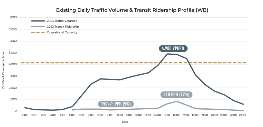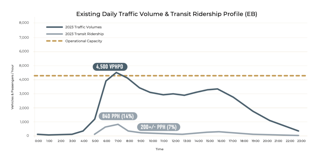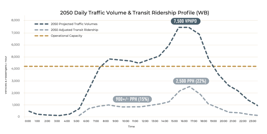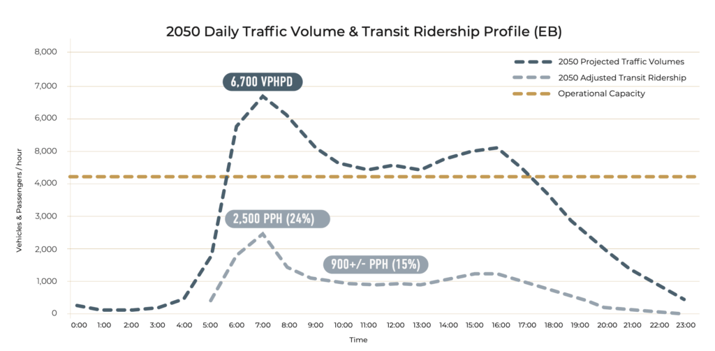 However, by 2050, Urban System’s demand projections predict that Highway 1 will be overwhelmed almost all day, from 5am to 5pm eastbound, and 7am to 7pm westbound.
