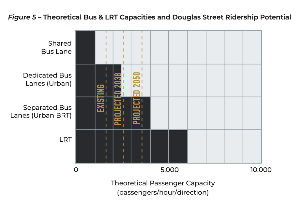 - Existing transit ridership already exceeds 2038 ridership estimates from 2011 along Douglas St (1600 passengers per hour per direction).