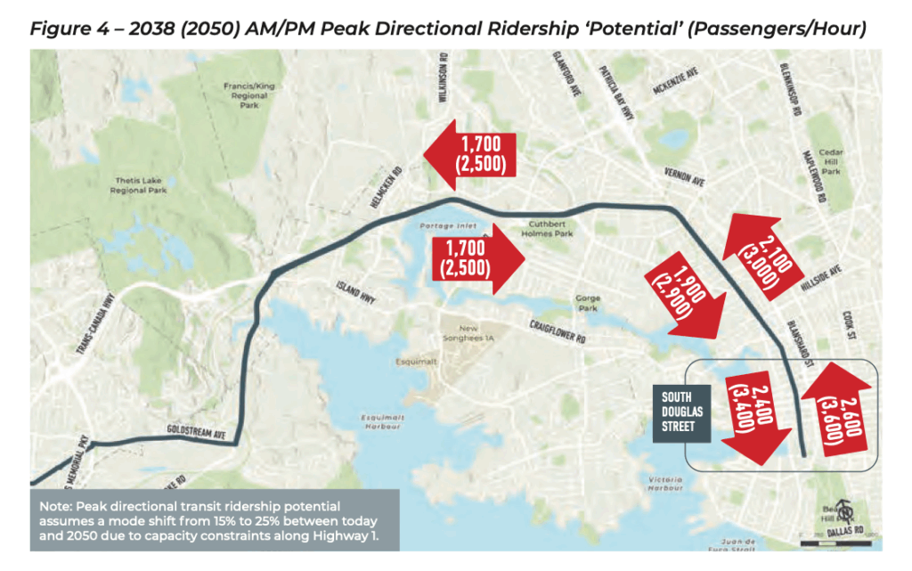 Today, approximately 1,500 to 1,600 passengers per hour ride transit along the south sections of Douglas Street. Further west along Highway 1 and Island Highway, transit serves approximately 700 to 900 passengers per hour. As a result of severe all-day traffic the report projects a 300% increase in transit ridership.
