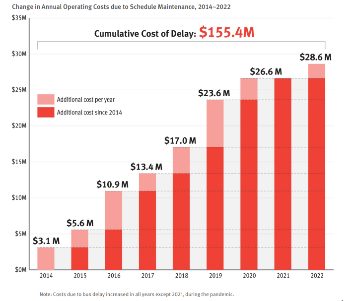 The effects of this “compounding inflation” can be seen clearly here. TransLink’s schedule maintenance needs over the last decade have directly caused the operating budget to increase by hundreds of millions of dollars. Imagine what our transit service could have looked like if that budget had been used on service expansion instead.