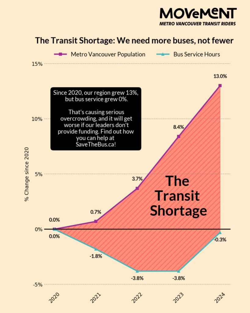 From before COVID, until last year, TransLink’s total bus service hours had increased by approximately 120,000 annually, or approximately 2%. However, that increase is entirely attributed to the cost of schedule maintenance. Once schedule maintenance is excluded, bus service hours in 2024 were actually lower compared to 2020, despite a 13% increase in Metro Vancouver’s total population.