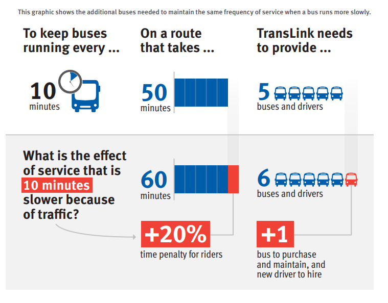 On that route that now requires 60 minutes to operate, where you only have enough funding to operate 5 buses on the route, you are now only able to provide service every 12 minutes. To a transit rider, that represents a substantial reduction in the amount of service, which will extend wait times and exacerbate overcrowding, despite no change to the required service hour budget.