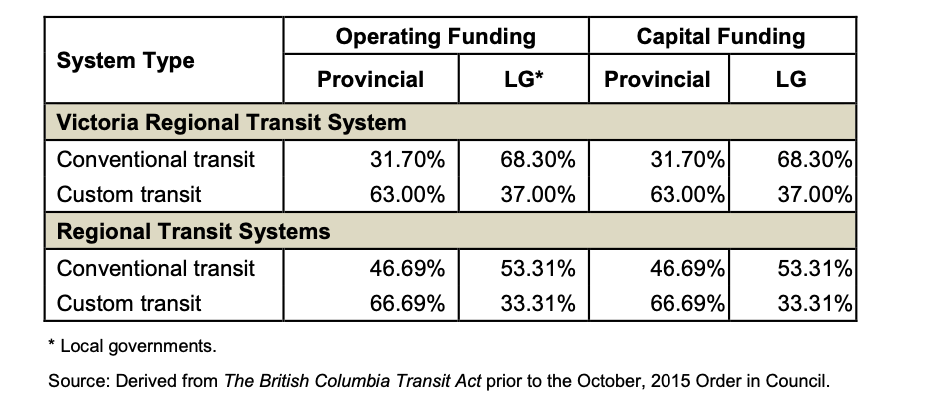 | Urban Transit | BC Transit | Provincial subsidies with statutory set funding split for Victoria. Yearly negotiations for funding levels. |